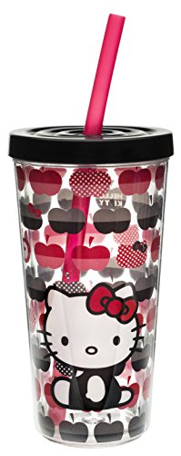 16oz insulated tumbler has a lid and straw for enjoying cold beverages on the go, featuring Hello Kitty