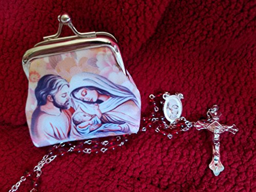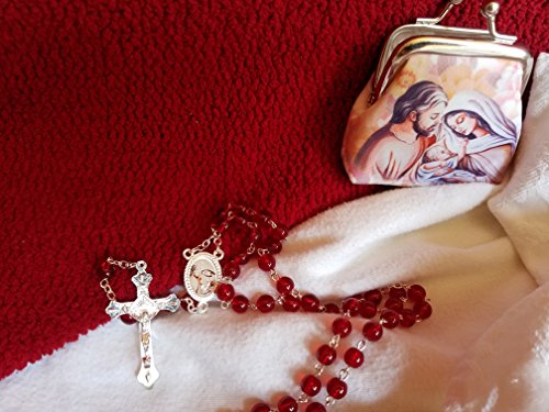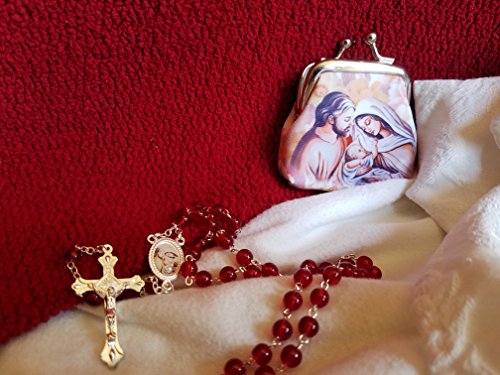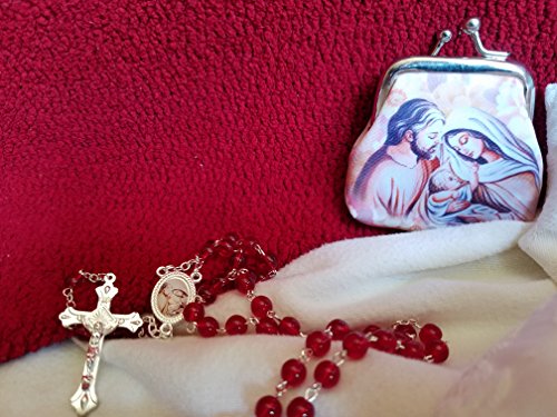 New Catholic Rosary Purse Set | Red Crystal Glass Beads with Holy Family Centerpiece & Crucifix | Made in Italy