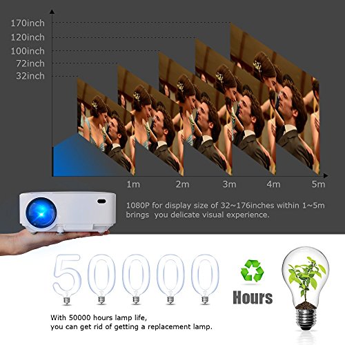 AMAZING WATCHING EXPERIENCE: 32”-176” with projector distance 1.5m-5m, the best projector distance is about 2-2.5m with the image size of 130”, which can make you enjoy best watching experience.