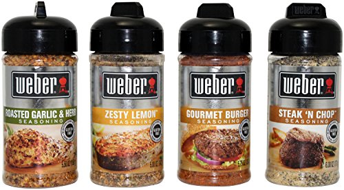 -. Feature : Weber Seasoning 4 pack assortment / Steak N'Chop Seasoning - 6 oz / Gourmet Burger Seasoning - 5.75 oz / Zesty Lemon Seasoning - 5 oz / Roasted Garlic & Herb Seasoning - 5.5oz