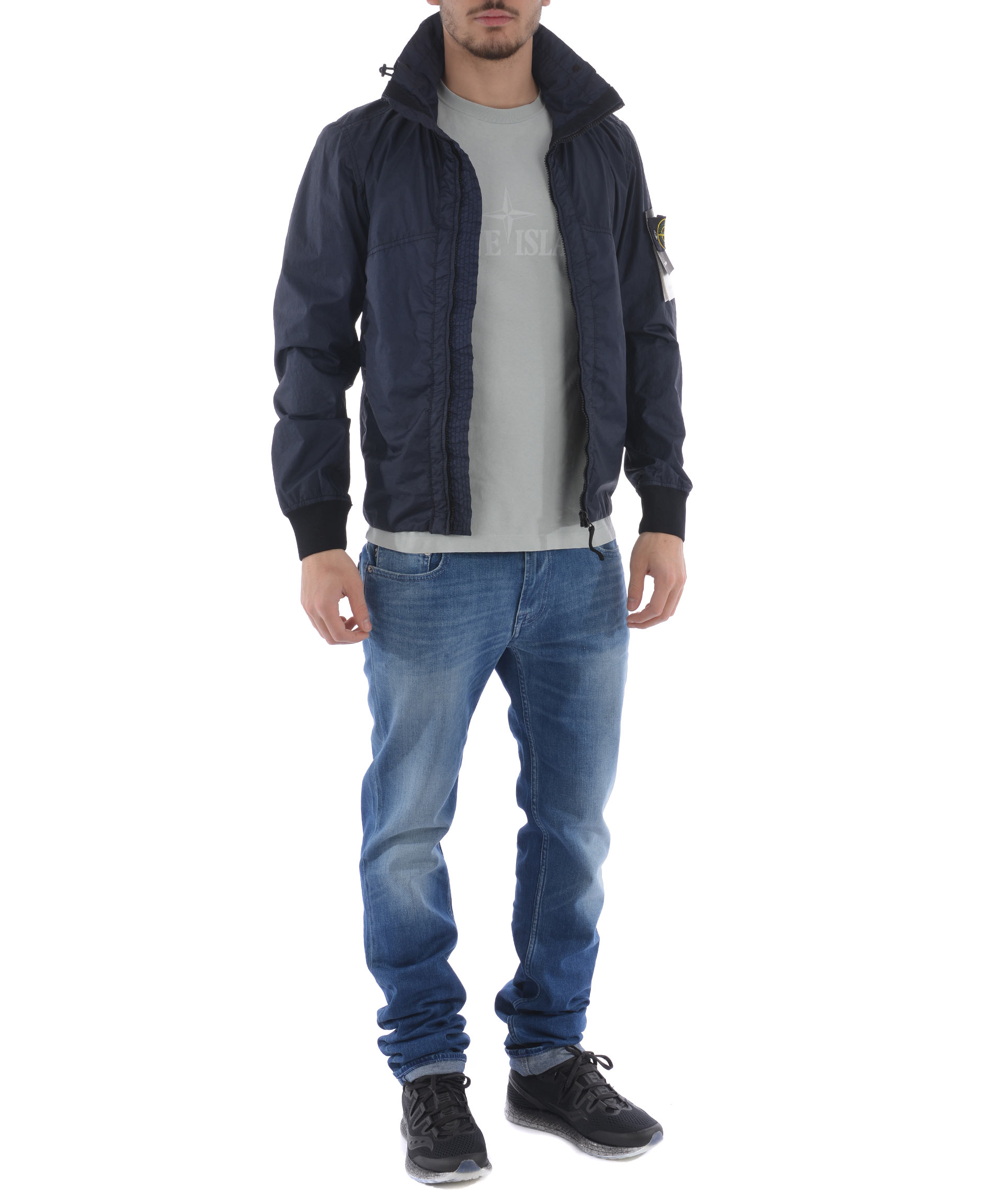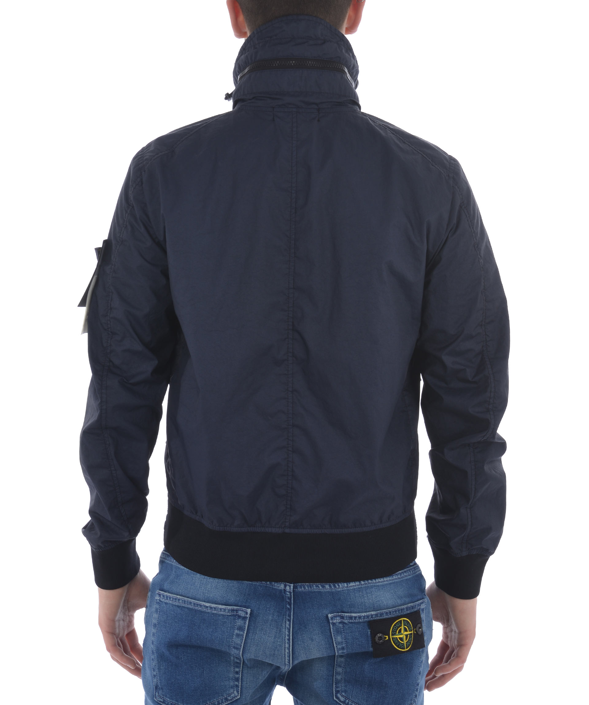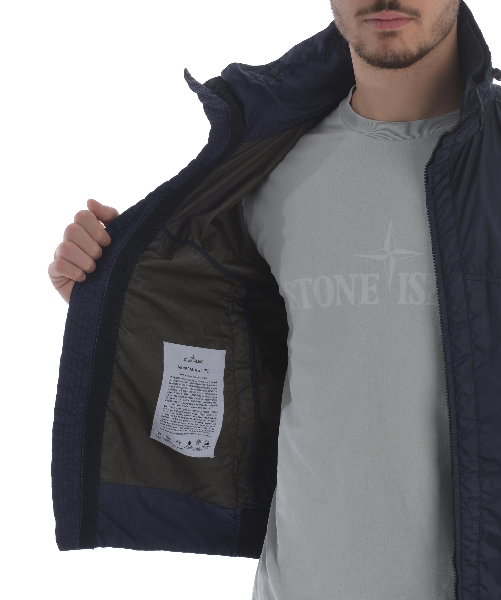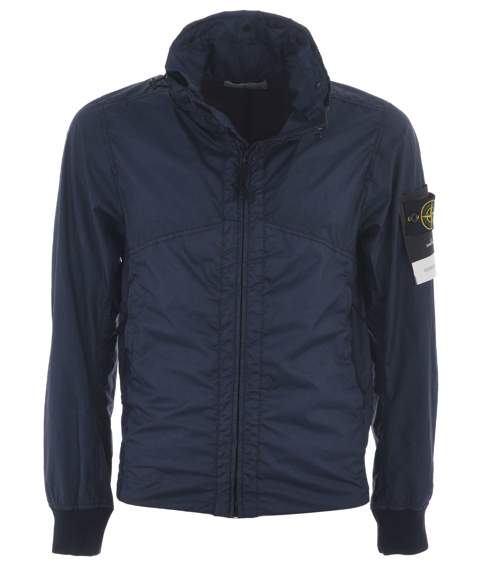Giubbotto Stone Island "membrana 3L-TC" in nylon opaco Blu. Idrorepellente, antivento. Collo alto con coulisse e cappuccio interno. Tasche frontali con zip. Chiusura frontale con zip. Polsi e fondo a costine. Interno sfoderato. Logo removibile sulla manica sinistra.
