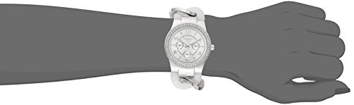 -. Feature : Round watch featuring silver-tone case with crystal-accented bezel and logoed dial with three chronographic subdials / Japanese quartz movement with analog display / Mineral crystal dial window / Features white resin and silver-tone twist chain bracelet with jewelry-clasp closure / Water resistant to 10 m (33 ft)