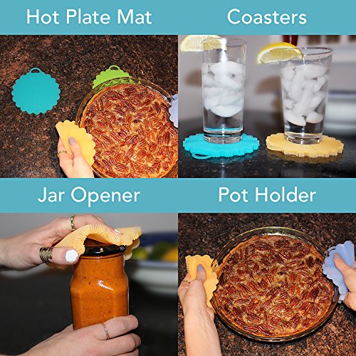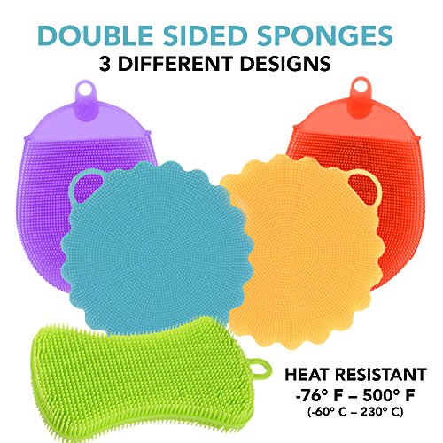 - MULTI-PURPOSE, MULT-FUNCTION variety pack allows for several uses. These double sided, BPA-free sponges come with 3 different designs, you determine which best fits your cleaning needs. Different sizes for small or large jobs. Heat resistant with temperature ranges from -76° F to 500° F (-60° C to 230° C) making them ideal as coasters, hot plate pads and pot holders. Their non-slip grip make them perfect jar openers. Use the glove for massaging, washing, or de-shedding your pet.