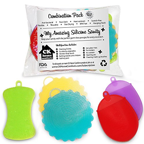 Amazing Silicone Sponges Variety Pack - Heat Resistant, Antibacterial, Mildew Free, Multi-functional - Bath, Body, Child, Baby, Pet, Kitchen, Dish & Vegetable Sponges, Mitt Brushes and Pot Holders