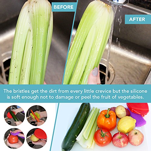 - KITCHEN AND VEGETABLE CLEANING with these non-abrasive, food-grade silicone sponges you can safely and effectively wash any fruit or vegetable; potatoes, carrots, peppers, celery, beans, cucumbers to name a few. The bristles are soft enough to clean without tearing tomatoes, grapes and mushrooms. Safely use them to clean almost any surface and dish. Not recommended for use as scour pads for pots and pans for stuck on messes. Because they are non-porous they also do not soak up or hold water.