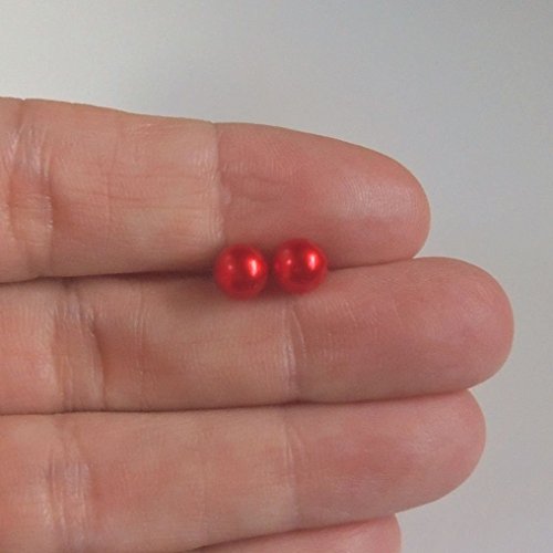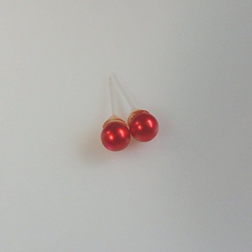 -. Title : 6mm Red Simulated Pearl Earrings on Hypoallergenic Plastic Posts for Metal Sensitive Ears