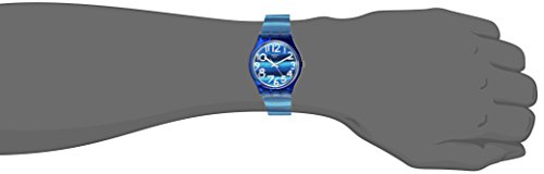 Blue plastic watch featuring round dial with contrast Arabic markers and baton-shape hands