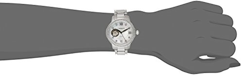 -. Feature : Stainless steel round case with crystal filled bezel on a stainless steel link bracelet / Mother-of-pearl outer dial with open heart at 9:00 position, roman numerals and crystal markers / Automatic-self-wind Movement / Case Diameter: 36.5mm / Water Resistant To 165 Feet