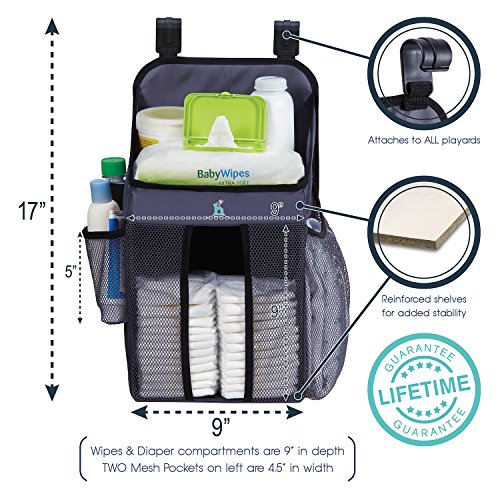 UNIVERSAL FIT FOR ALL PLAYARDS - featuring C-clip hooks specially designed to hook onto playard frames, your diaper organizer will any brand of playard on the market.