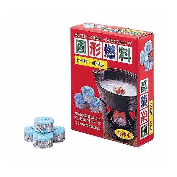 キャンプでの着火材としても、使用できます。 生産国:中国 素材・材質:アルコール 商品サイズ:(約)φ4.5×2cm 重量:約20g(1個あたり) 仕様:燃焼時間(目安):1個約18分 ※サプライヤー直送品 ご注文後3~4営業日後の出荷となります【商品名】固形燃料ゆうげ40個入り