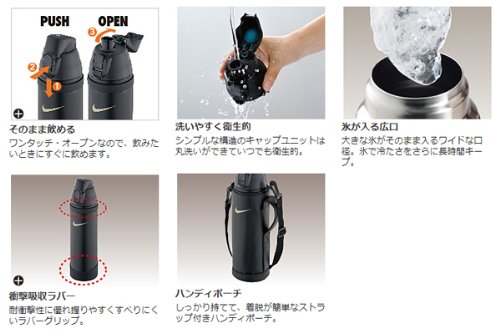 NIKE(나이키) 하이드 레이션 보틀 1.0L 입니다.기본 컨셉은 스포츠시의 보다 효과적인 수분 보급.보냉력 이 뛰어난 마법 편 구조의 본체.내충격성보다 뛰어나 쥐기 쉬어 미끄러져 어려운 러버 그립 채용.원터치 오픈에 그대로 마실 수 있는 스포츠 보틀.본체로도 내충격 성이 뛰어난 러버가 붙고 있습니다.스트랩 딸린 핸디 파우치 부착.보냉 효력(6시간)9도 이하 FFC-1002FN