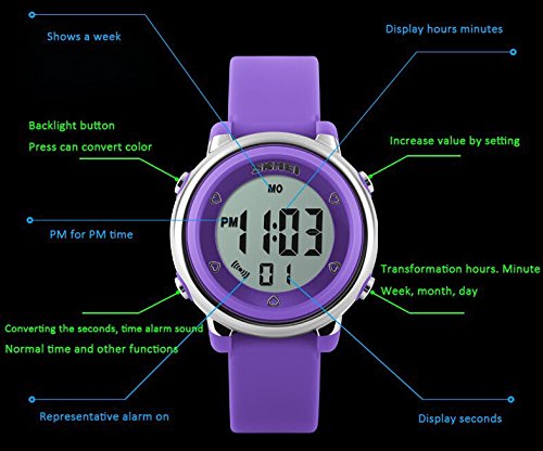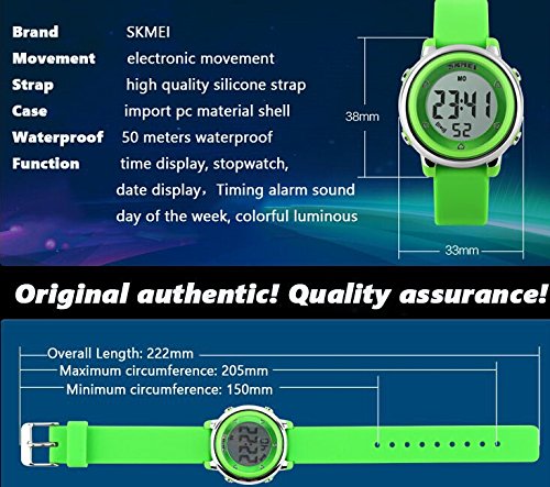 Item Type:Wristwatches Gender :children Dial Display: Digital Case Shape:Round Band material: Highly PU Case Material:Stainless Steel Dial diameter: 3.3 cm Dial Size: 3.3cm * 3.8cm Strap length: 22.2 cm Dial thickness: 1.3cm Weight(Approx): 45g The waterproof depth is up to 50M (Please Don't Press Any Key Underwater) Condition:New with tags High transparent resin glass Stainless steel back case with Hi-tech laser logo Children Watch Model: Children's WatchesFeature