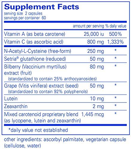 Macular Support Formula is a combination of powerful antioxidants and botanicals designed to protect and support the macula, the central area of the retina responsible for sharp vision. Since the macula is extremely susceptible to free radical damage, current research emphasizes the importance of antioxidant supplementation in maintaining and improving macular health. N-acetyl-l-cysteine, a glutathione precursor, has been shown to protect against oxidative damage to the lens and to support healthy glutathione levels. Glutathione is one of the natural antioxidants found in retinal tissues. Bilberry, containing anthocyanidins, may help moderate visual fatigue and improve light to dark adjustments. Combined with these cofactors, grape seed extract helps provide antioxidant balance in the retina. This formula is also enhanced with lutein and zeaxanthin, the only two carotenoids found in macular pigment. Lutein and zeaxanthin promote the integrity and density of the macular pigment, as well as help maintain the health of the optical lens. The antioxidant activity of carotenoids and vitamin C provide optimal macular protection and ocular health.Feature