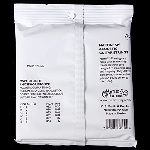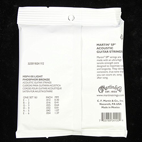 ReleaseDate : 2010-08-20 Studio : C.F. Martin Co. Publisher : C.F. Martin Co. Binding : Electronics Product Description Martin MSP4100 Phosphor Bronze Light Acoustic Guitar Strings are made from a 92/8 composition alloy to give that brilliance, clarity, and longevity of sound required by serious guitarists. The phosphor bronze winding alloy is ideally suited for making strings that have deep, rich basses and clear, bright trebles that today's acoustic guitarists demand. Martin strings are high-quality strings designed for daily use. Martin acoustic guitar strings are wound to precise specifications. Core and wrap wires must meet strict requirements to make the grade. 0