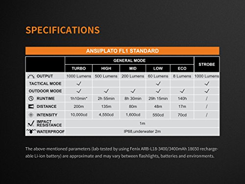 1000 Lumen max utilizing Cree XP-L (V5) LED with a lifespan of 50,000 hours