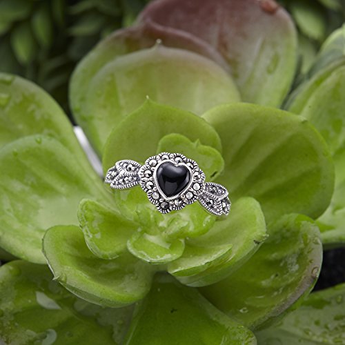 -. Title : 925 Oxidized Sterling Silver Swarovski Marcasite Black Onyx Heart Leaf Ring - Nickel Free