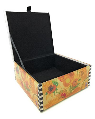 -. Feature : Beveled Glass Jewelry/Keepsake Box, by Value Arts. / It features an image of Sunflowers by Van Gogh. / Inside and outer bottom is lined with black velvet. / Both decorative and useful to store your treasured jewelry and keepsakes. / Measures 4.75" W x 4.75" L x 2" D. Made in China.