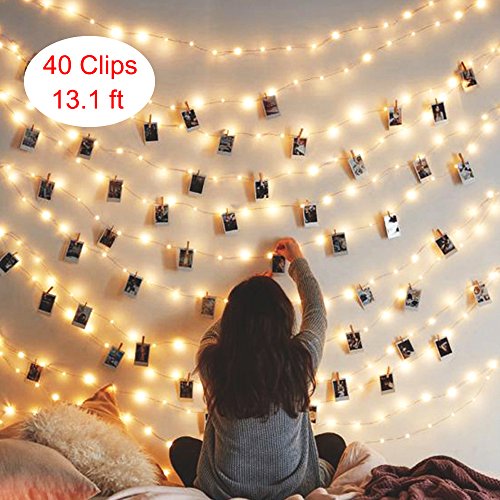 String Lights for Bedroom With Photo Clips, Battery Operated 40 LED Photo Clips 13.1ft, Warm white Lights Wedding Party Christmas Propose Indoor for Hanging Photos, Memos and Artwork