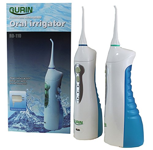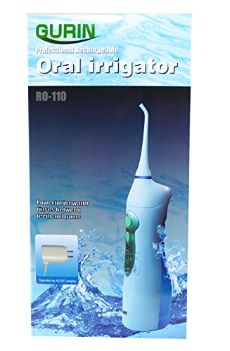 Lightweight and rechargeable, the Professional Oral Irrigator by Gurin Products provides and easy and effective way to support proper teeth and gum health at home. Our Oral Irrigator now comes with Rechargeable Nicd batteries, This gives you much more power and battery life. Daily irrigation helps reach places brushing simply can not, promoting cleaner teeth and healthier gums. The result, an incredibly clean, fresh happy mouth. Irrigating is easier and less abrasive than string floss. This irrigator is a powerful water jet which helps remove debris deep between teeth and reduces the risk of bacteria build-up in crevices and below the gum line. Add in a little mouthwash for an extra fresh feeling. Irrigating is great for hard to reach spots, especially for people with bridges and braces. The irrigator comes with 2 interchangeable nozzles, great for multiple users. Three operating modes are useful for varying oral care needs: Normal, soft and pulse. Pulse mode comfortably massages the gums. The extra large reservoir is removable and easy to refill. Cordless design powered by rechargeable batteries.