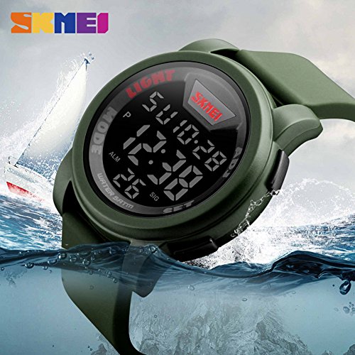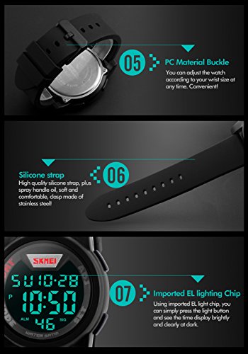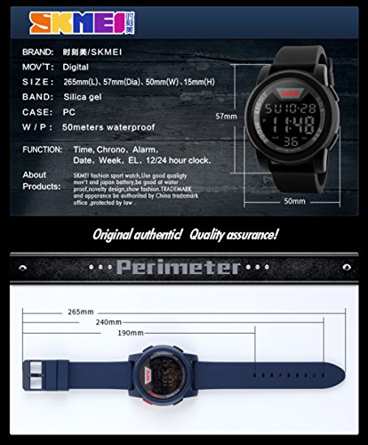 -. Feature : Multifunction Watch: Time, Date, Week, Alarm, Chrono, EL Light, 12/24 Hour Clock / Soft and comfortable Silicone watch band / 50M Water Resistance / Japanese movement and battery lasts 2-3 years / Charming for all occasions. Amazing looking watch, a great gift for your relatives and friends