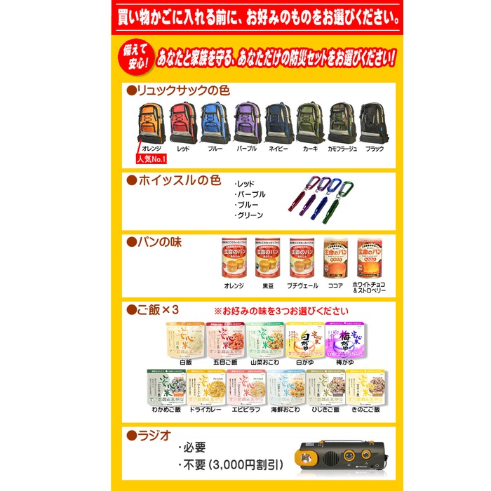 원본상품명: 防災セットBアルファ米もパンも自由に選んで自分好みに(防災グッズ 防災セット 1人用 防災用品 非常食 リュック エア?マット 防災ラジオ 家族 避難セット 非常用持ち出し袋)