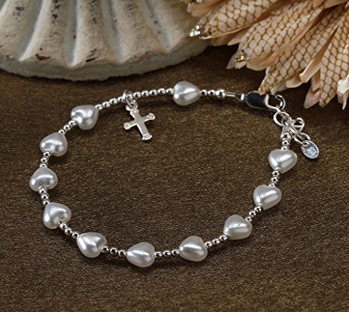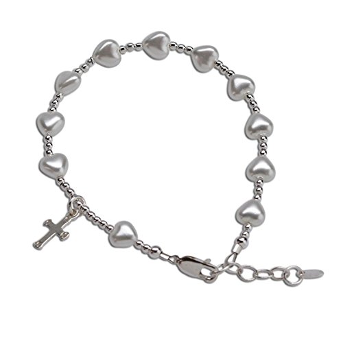 Children's Sterling Silver Cross First Communion Rosary Bracelet with Simulated Pearl Hearts (6-12 years)