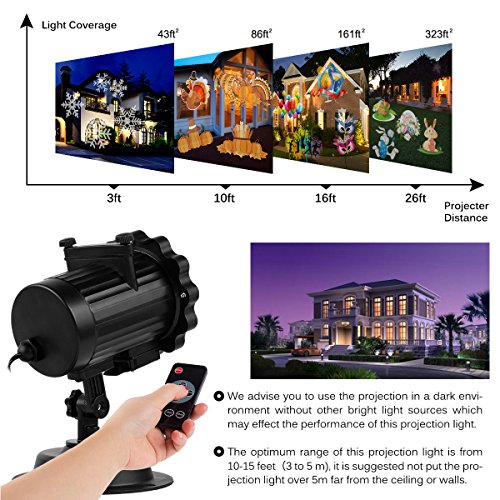 【Projector with Clear Image】: This projector light covers about 25 square area. It comes with 16 interchangeable colorful projection images instead of black or white images. In a dark room, the pictures are very sharp, bright and clear, you also have the choices of speeding up or slowing down with the controller