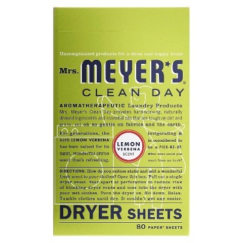 Product Description Mrs. Meyer's Clean Day Dryer Sheets are a perfect way to reduce static and add freshness to your clothes. Our dryer sheets contain a vegetable-derived softening agent and essential oils on a paper sheet. Made in the USA. Ingredients are at least 99% naturally derived. Style and color assortment may vary Package Quantity: 80 Used For: Dryer Product Form: Sheet Number of Uses: multiple Product Formulation: Antistatic Recommended Surface Application: Fabric, Clothing Scent: Lemon Verbena, Lavender Product Results: Anti-static, Softening Travel Size: No Health Facts: Phosphate-free Product Warning: keep out of reach of children 0