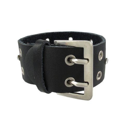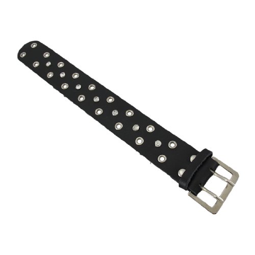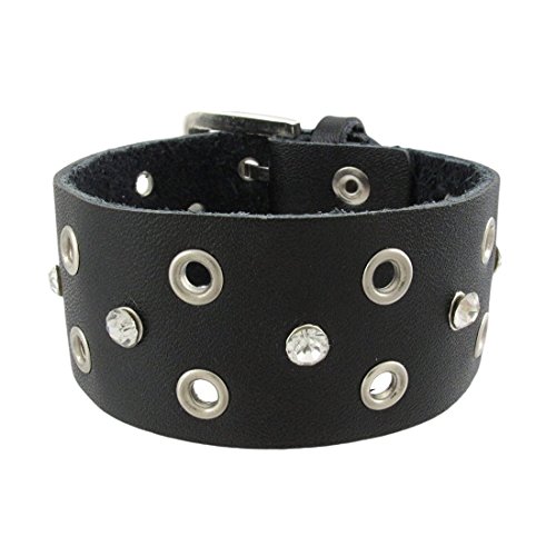 Studio : Zeckos Publisher : Zeckos Binding : Jewelry Product Description This beautiful black leather bracelet features a row of gleaming faceted clear crystal rhinestones down the center. The bracelet has a buckle clasp, with two tongues that fit into the double rows of grommet studs that sandwich the rhinestones. The wristband is 1 1/8 inches wide, and fits up to an 8 inch wrist. This wrist band makes a great gift for friends and family. 0