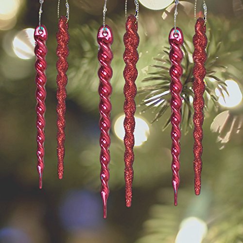 - RED ICICLE ORNAMENT. Assorted set of shiny red icicles and glittery red icicles. You will receive 24 of each finish in this pack. They are perfect to hang on your CHRISTMAS TREE, holiday DIY wreath, along your banister with greenery or hanging in window. Add them to the top of presents for a fun, holiday look.