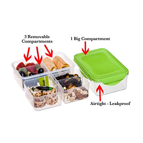 - PERFECT FOR MEAL PREPPING - Ensure your portion sizes are appropriate with the 3 removable compartments (one large, two small) within our bento box. You can choose to use all, some, or none of the removable compartments, depending on the healthy meal or snacks you wish you take with you. Food in each separate compartment, stays within its’ own compartment- no mixing together, even whilst on the move!