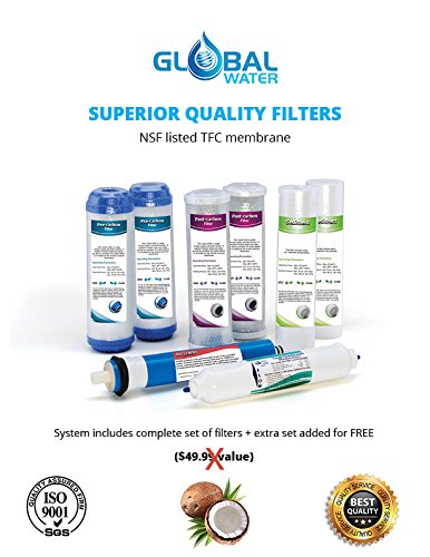 Studio : Global Water Publisher : Global Water Product Description GLOBAL WATER REVERSE OSMOSIS FILTRATION SYSTEM Global Water provides high performance filtration system for healthy, clean, fresh, great-tasting purified water at a reasonable and affordable price. Our Reverse Osmosis system reduces the quantity of dissolved solids in solution and removes up to 99% of contaminants that are washed from the membrane and disposed of- such as chlorine, lead, bacteria, arsenic, fluoride, etc. We are proud to deliver HIGH QUALITY RO system including LEAD FREE faucet and tank complies with NSF/ANSI standard 58. Global Water is designed to meet your requirements and offer you and your family a proficient RO system with high quality drinking water. Contact our professional technical support team for any further questions (818) 404-6677 or (818) 585-6979 SYSTEM SPECIFICATION 1st Stage: Polypropylene 5 micron Sediment filter- removes the particles, dust, mud, sand and more. 2nd Stage: GAC coconut shell activated carbon 10 inch filter- removes the chlorine, organics, odor smell, turbidity, colors and other VOCs chemicals. 3rd Stage: CTO 5 micron coconut shell block carbon filter- removes cloudiness, chlorine, odor smell and taste and other VOCs chemicals. 4th Stage: RO membrane- High quality TFC RO membrane that removes up to 99% of contaminants including heavy metal, salt, bad mineral substance, arsenic, chlorine, lead, fluoride, and other dissolved chemicals. 5th Stage: Inline filter cartridge quick connect- (polishing filters) removes all possible rough tastes and odors. SET INCLUDES RO system 2 sediment filters 2 GAC activated carbon filters 2 CTO block carbon filters 1 Membrane 2 Inline filters Tank Faucet Colored Tubing Installation Kit and Valves. 0