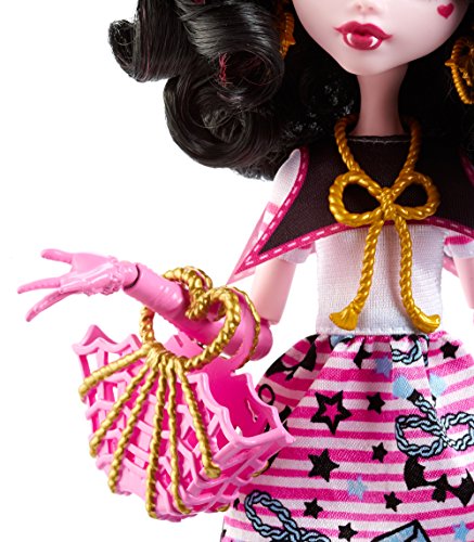 This Monster High doll is an absolute treasure! In the new Monster High adventure Shriek Wrecked, the ghouls make waves on the high seas. Celebrating nautical themes, the Monster High dolls look positively swashbuckling in outfits inspired by their monster legacies and seafaring style. Draculaura doll, daughter of Dracula, is fangtastic in a pink dress with heart and anchor print, sailor stripes and a sailor cape. A sailor hat, rope necklace and rope-decorated shoes make fierce accessories, and a pink and white spider web-inspired purse is gore-geous. Create sea-sational action and tell your own pirate tales. Collect all of the Shriek Wrecked dolls and accessories for a full crew (each sold separately, subject to availability). Includes Draculaura doll wearing fashions and accessories, plus bag. Doll cannot stand alone. Colors and decorations may vary.Feature