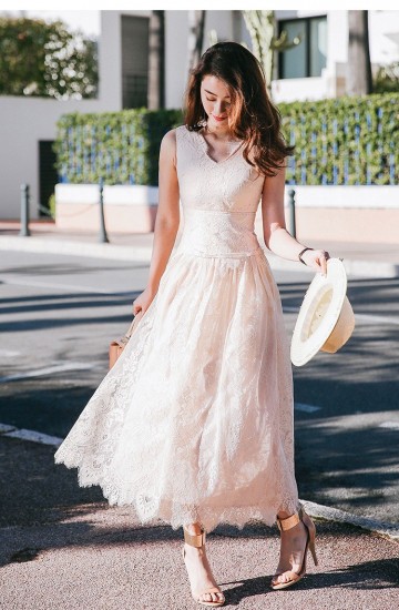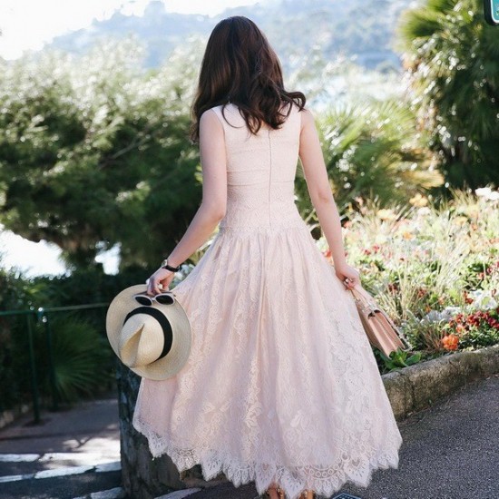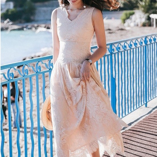 ワンピース ロング丈 パーティードレス 総レース ノースリーブ フレア ベージュ ギャザーフレア 大人 上品 お呼ばれ デート drgz2239