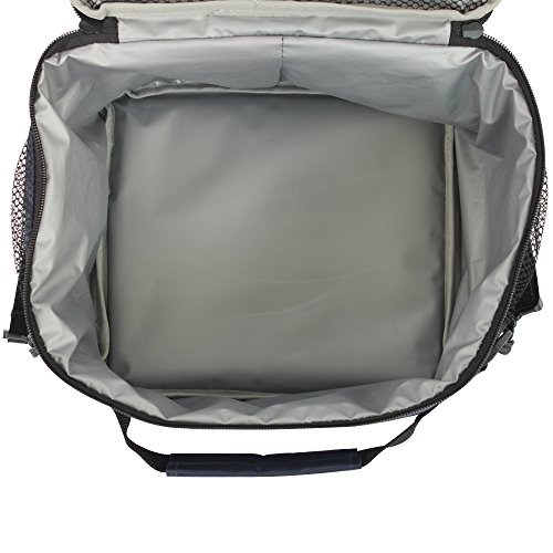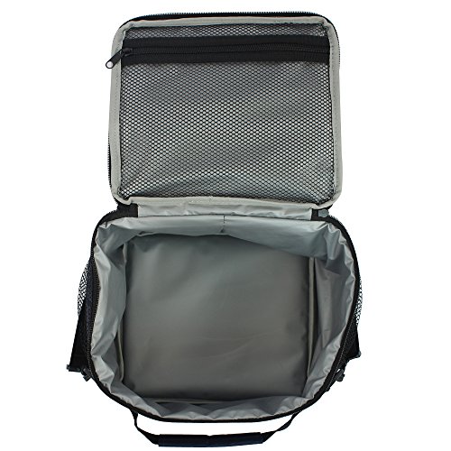 Main compartment accommodates food storage containers, two side mesh pocket for added storage, front pocket keeps keys, phone and wallet easily accessible.