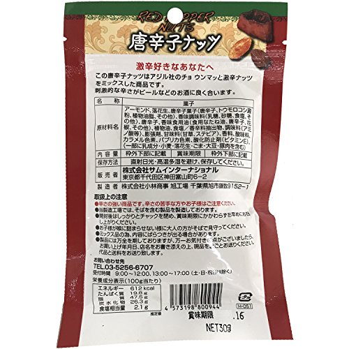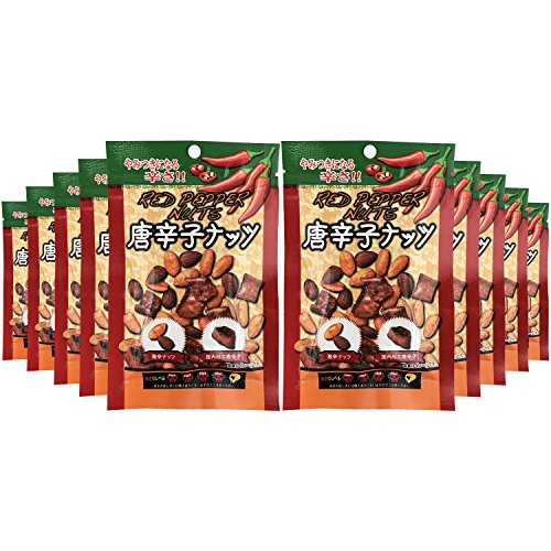 原材料:アーモンド、落花生、唐辛子菓子(唐辛子、トウモロコシ澱粉、植物油脂、その他)、香味調味料(乳糖、砂糖、食塩、その他)、唐辛子、香味食用脂(食用なたね油、唐辛子、花椒、その他)、植物油、食塩/香辛料抽出物、調味料(アミノ酸等)、膨張剤、甘味料(甘草、ステビア)、香料、酸味料、カラメル色素、パプリカ色素、酸化防止剤(ビタミンE)、(一部に乳成分・小麦・落花生・ごま・大豆・豚肉を含む)