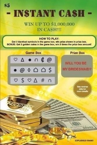 Studio : Easyshop-123 Publisher : Easyshop-123 Binding : Health and Beauty Product Description Looking for the perfect way to ask out your bridesmaids? We understand that it can get frustrating thinking of unique ideas. We have therefore created the perfect surprise idea, in the form of a fake lottery card! You will have your bridesmaid so surprised, and both of you will always remember this important moment! ? The game is very simple: In the left box, underneath the gray scratch area, there is a series of random symbols. In order to win, the player must identify 3 of the same symbols. Once 3 of the same symbols are identified, the player then scratches the prize box to the right, where it will state "WILL YOU BE MY BRIDESMAID?". Of course, every lottery card is a winner, with 3 matching heart symbols. Each card measures 4" x 5.75", for the perfect authentic looking size! Fake lottery ticket can fit in any standard size envelope (envelope not included).? Cards are fake and only a replica of lottery cards, and have no redemption value. For fun purposes only! ? If you are to have any questions or concerns, please do not hesitate to message us, and we will gladly help you right away.? Many customers have successfully asked out their bridesmaids with this fun game, and were very happy with the results! This is the perfect idea, and you will definitely be truly satisfied! ? Also great for those who enjoy playing lottery games! ? Hope you enjoy, and have a happy marriage!! 0