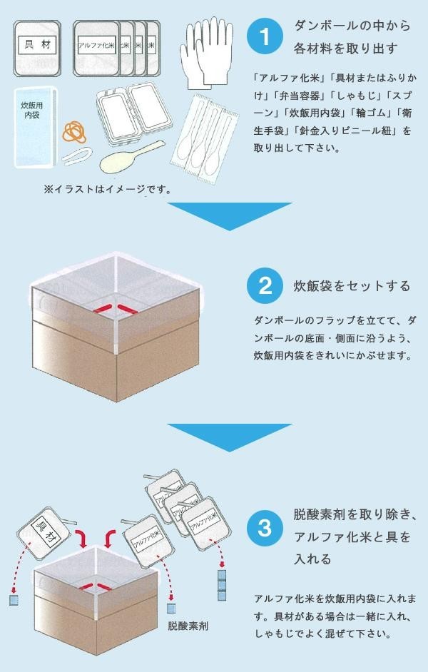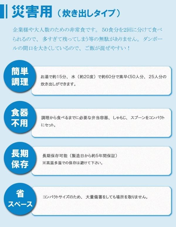 油揚げと椎茸、ごぼう、人参、こんにゃくを入れた、風味とコクの豊かな炊き込みご飯です。ダンボールに炊飯袋をセットし、米と具材を入れてお湯か水を注ぐだけ♪密封してしばらく待つと出来上がりです!!25食分ずつ作れるから作り過ぎの心配もありません。弁当容器・スプーンなどもセットされています♪ |