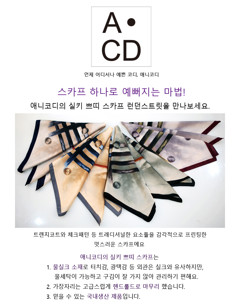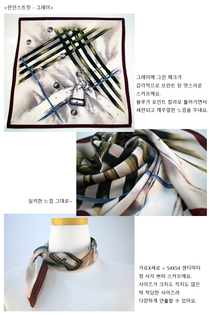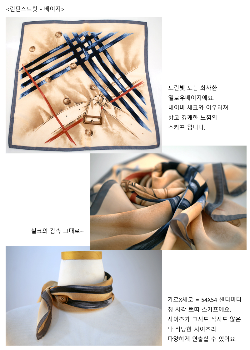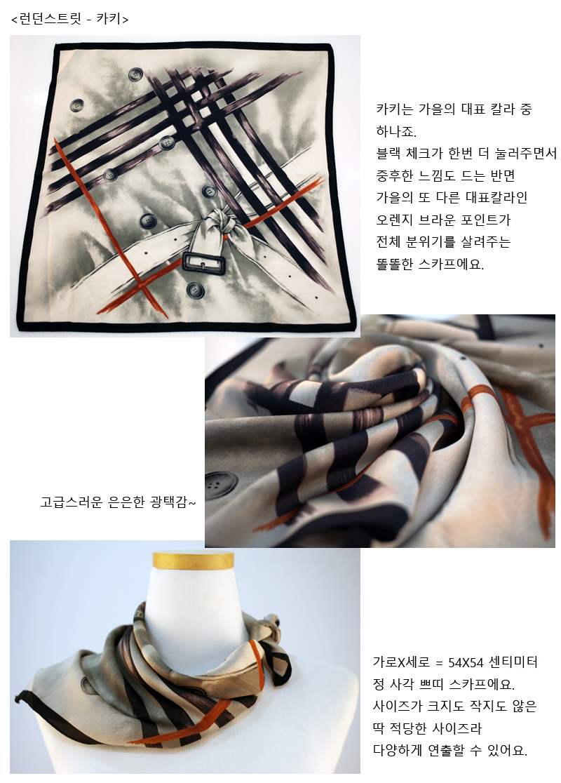 트렌치코트와 체크패턴 등 트래디셔널한 요소들을 감각적으로 프린팅 한 멋스러운 스카프입니다.