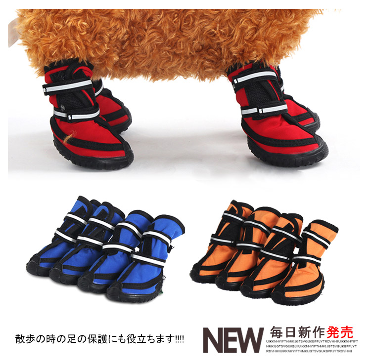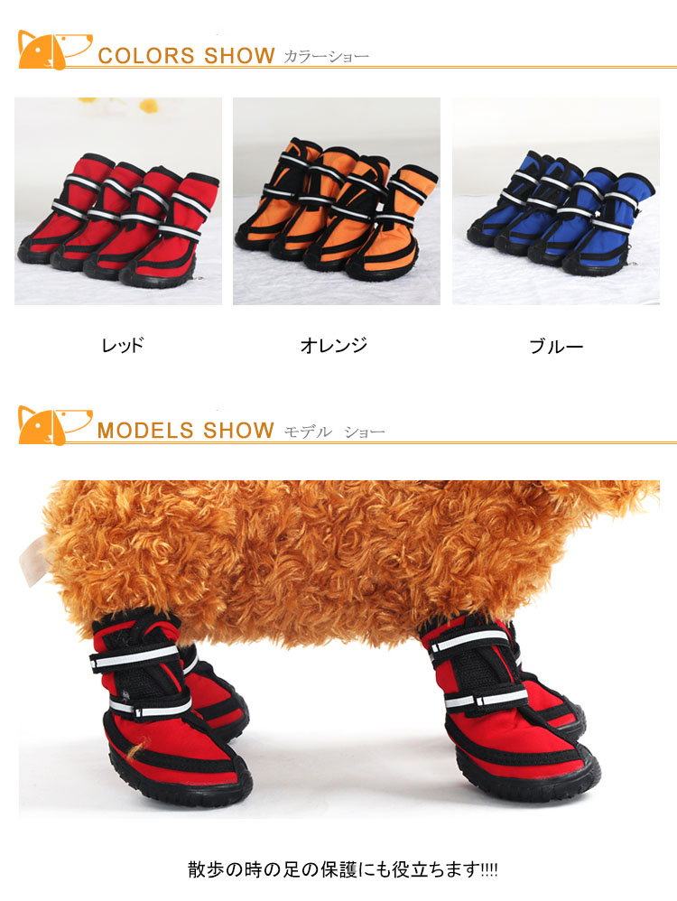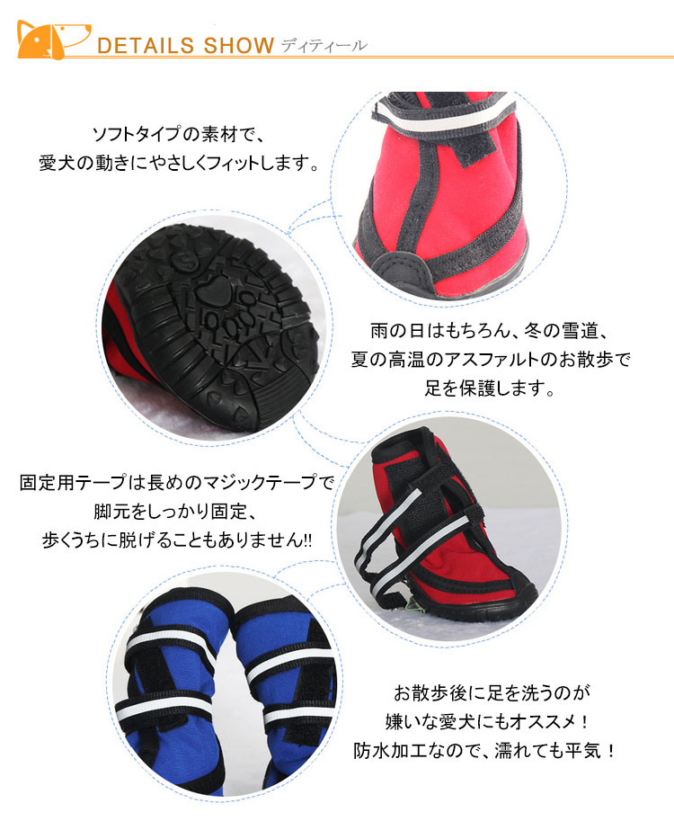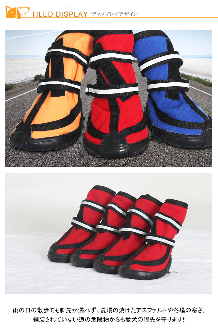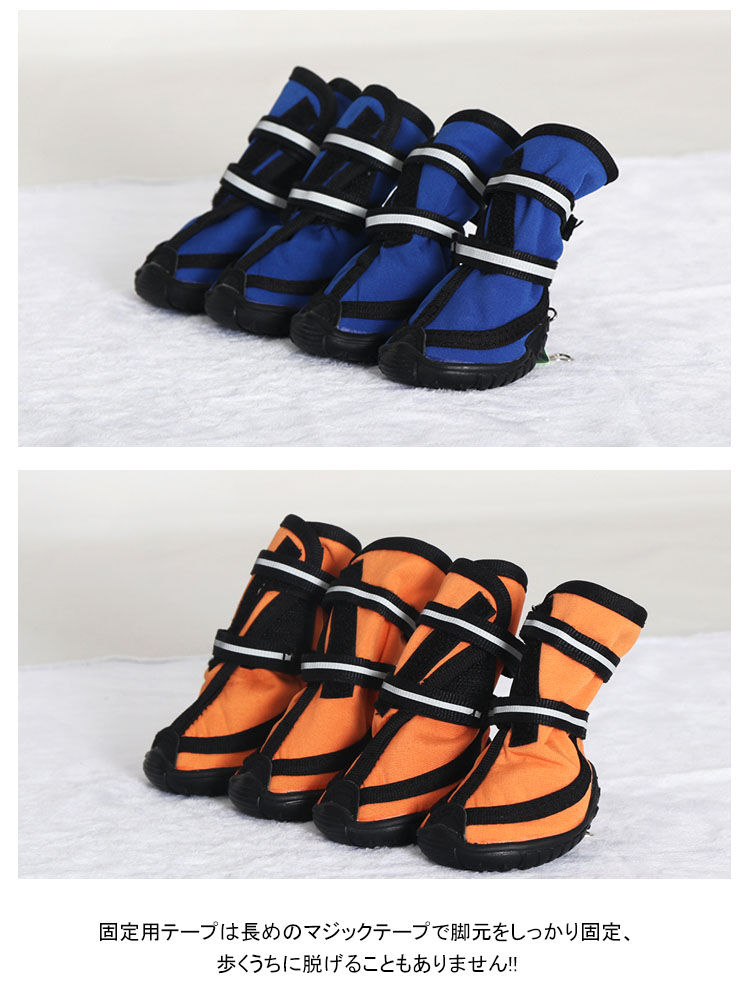 | 散歩の時の足の保護にも役立ちます!!!!雨の日の散歩でも脚先が濡れず、夏場の焼けたアスファルトや冬場の寒さ、舗装されていない道の危険物からも愛犬の脚先を守ります!!固定用テープは長めのマジックテープで脚元をしっかり固定、歩くうちに脱げることもありません!! | |