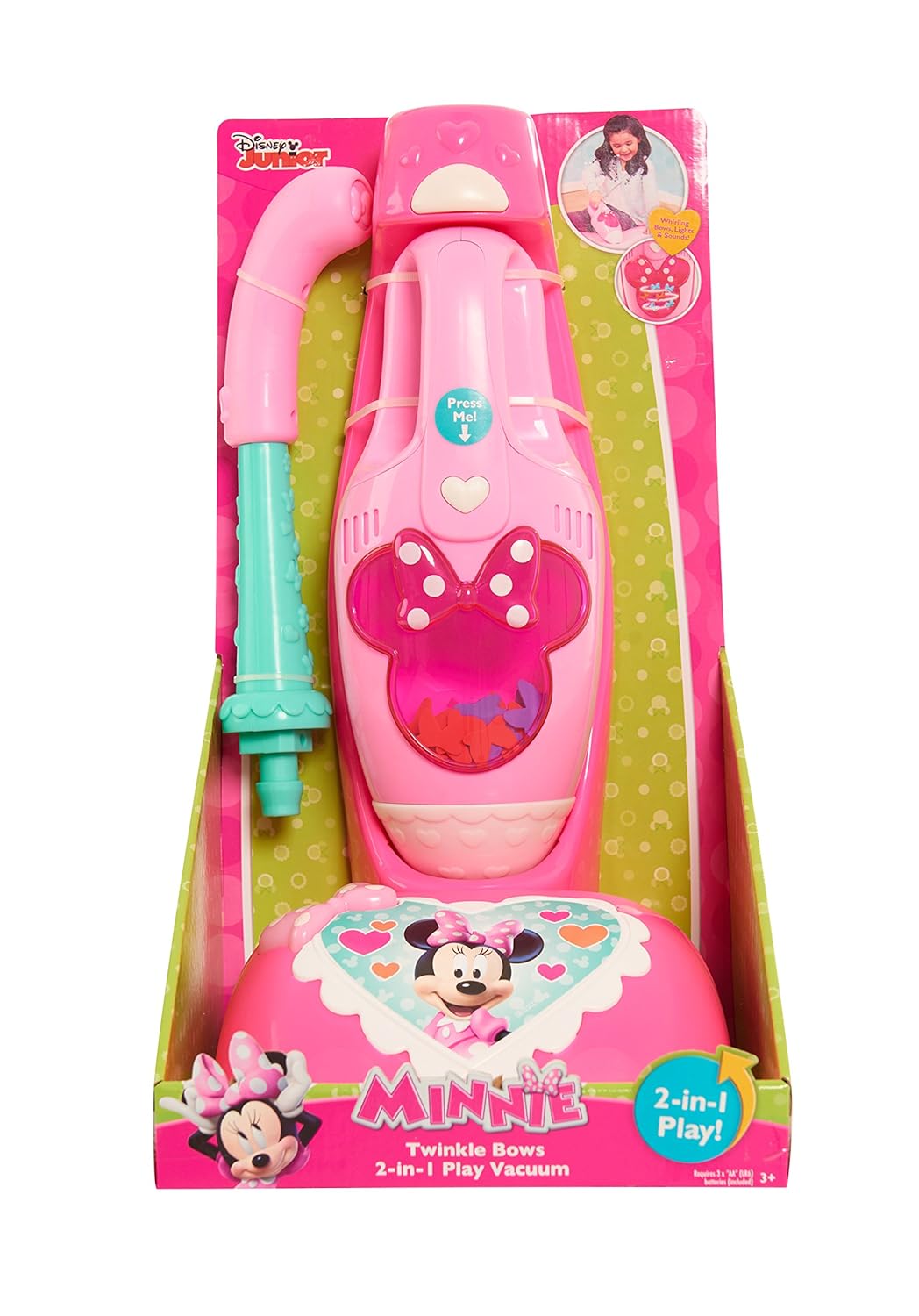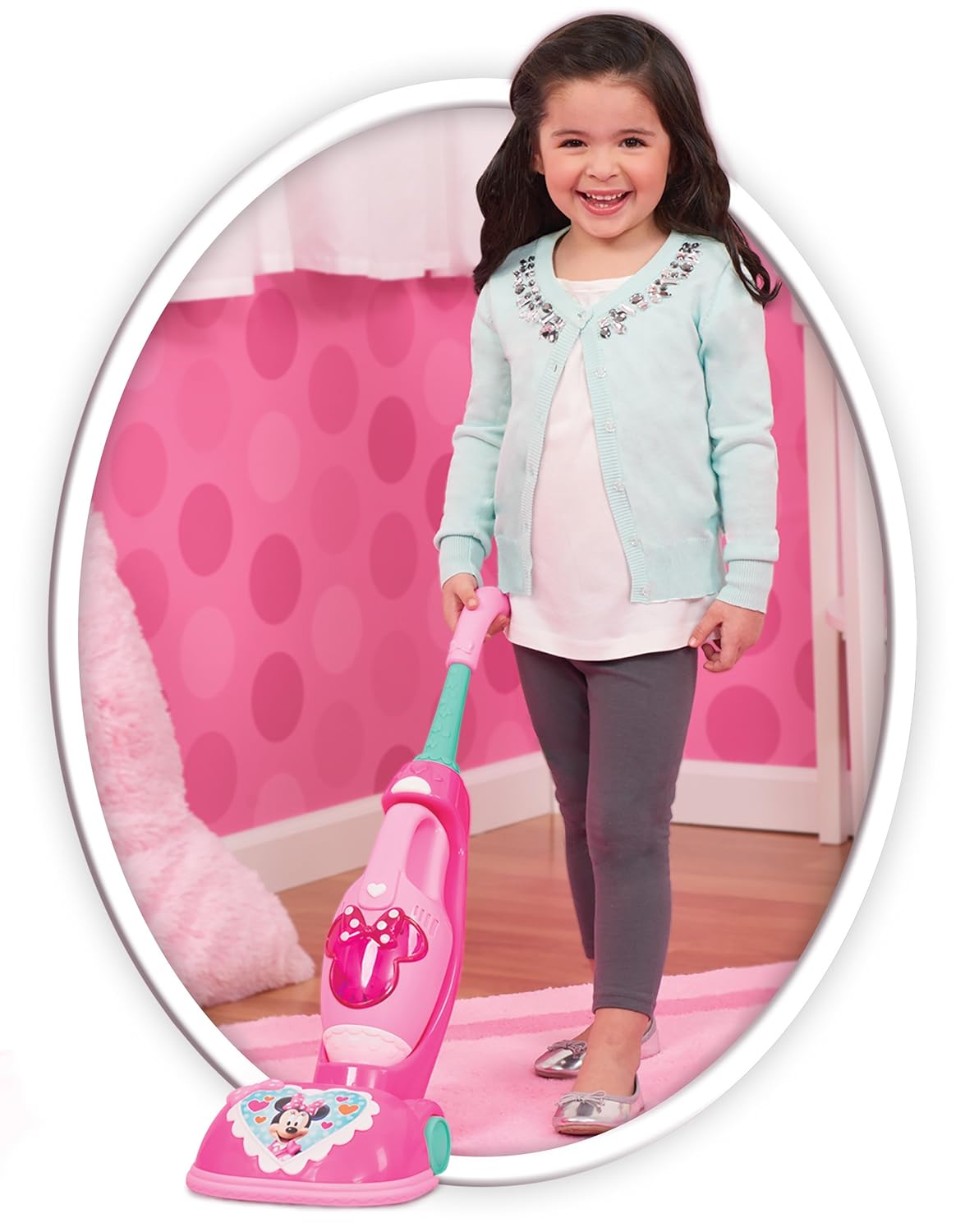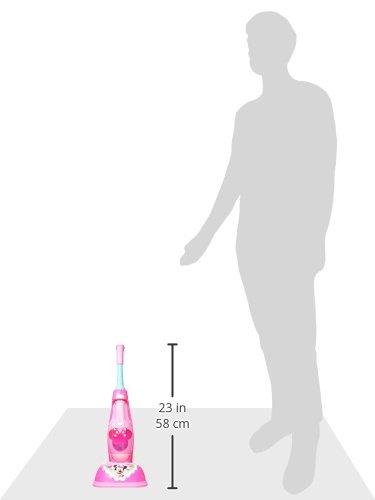 ハートのボタンを押すと、掃除機のような音を鳴らしながら、ミニーアイコンのピンクのケース部分がライトアップし、中のビーズが回転します。 動作には単三電池3本を使用します。 実際にゴミを吸う機能はありません。 サイズ: 41.1cm x 23.2cm x 22.8cm, 1.3kg 対象年齢3歳以上\