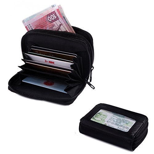 Features 2 zippered compartments for your cash and coins, see through ID window, and accordion folds that comfortably hold 12 credit cards