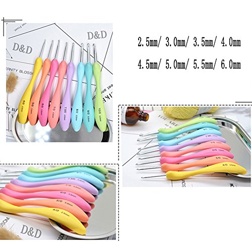 D&D Set of 8 pcs Multicolor Crochet Hooks Knitting Needle Craft Yarn 2.5-6 mm - Soft Plastic Ergonomic Handle, Smooth Aluminum Hooks