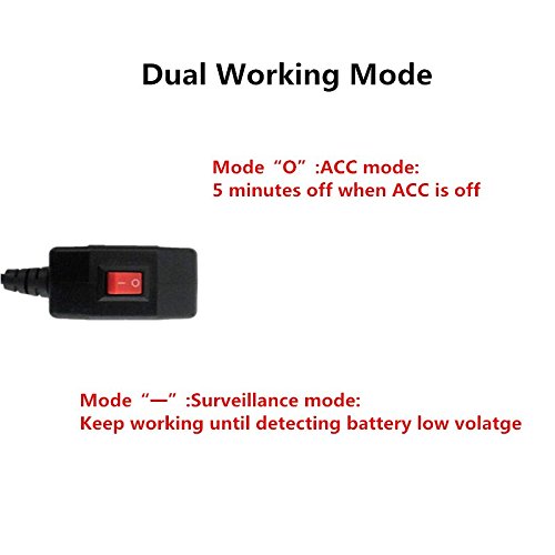 Dual working mode switch button integrated for your convenience: 1.ACC working mode,5 minutes off when your car ACC is off; 2. Surveillance working mode, keep working until it detects low battery voltage(11.6V).