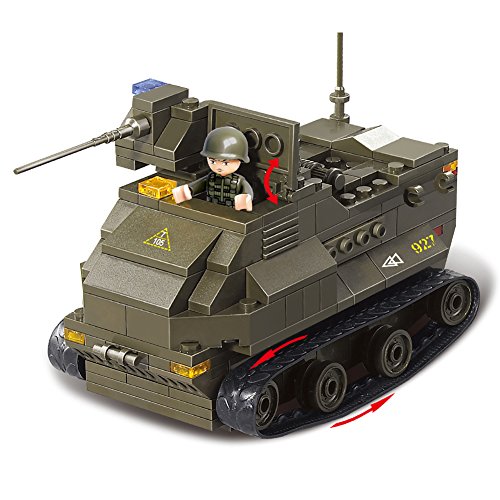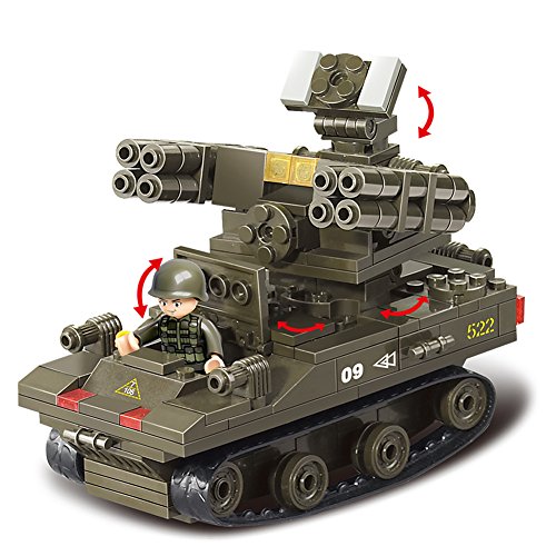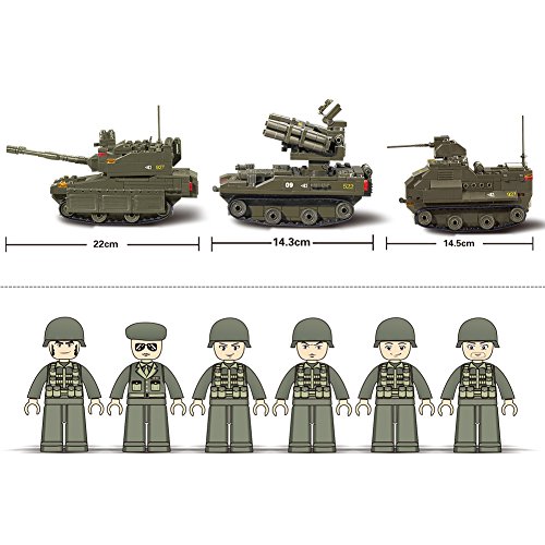 Product information: -Material: ABS Plastic -Pieces: 609 PCs (Can build 1 Amphibious Armored Car 1 T-90 Tank 1 Leopard II Tank 6 Soldiers) -Product Size: 【Amphibious Armored Car】: 3.77 " X 4.89" X 5.71", 【Leopard II Tank】: 2.52" X 6.02" X 5.98", 【Tor Anti-aircraft missiles】: 3.14" X 4.8" X 5.62 " -Crawler: The crawler use simulation rubber which can make the motion status of the car tank more similar with the real one. -Color: The whole car tank painted into vivid Army Green. -Features: 【Amphibious Armored Car】: The Amphibious Armored Car's viewing stand can be closed and opened. The back of the car can be opened and store some tinny items. 【Leopard II Tank】: The Leopard II Tank's 3 dormers can be opened at the same time. The upper part of the Leopard II Tank can be rotated 360 degrees. 1 soldiers can stand on top of the tank. 【Tor Anti-aircraft missiles】: Tor Anti-aircraft missiles' target acquisition radar can adjust the angle and can be rotated. The front dormer can be opened and closed.