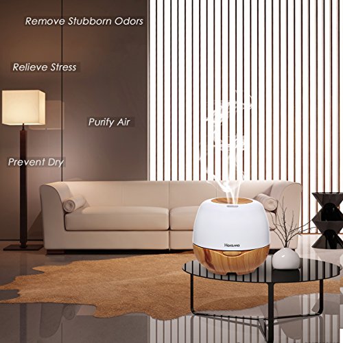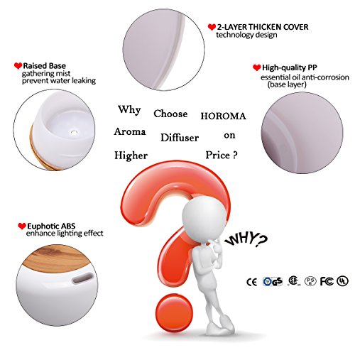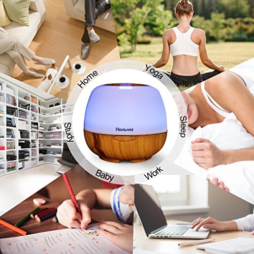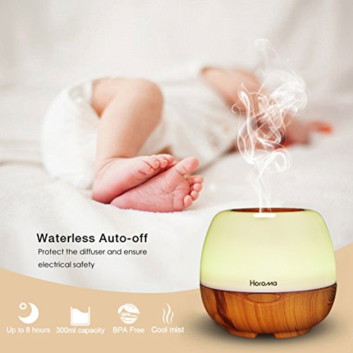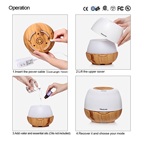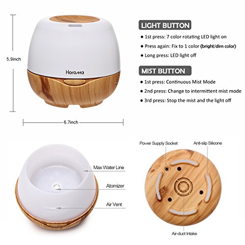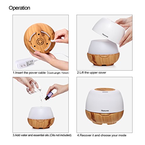 Specification: Capacity:300ml Working Time:Up to 8 hours Light Mode: 7 color rotating LED light on / Fix your favorite color / LED light off Wist Mode: High wist (30ml/h)/ Low wist(20ml/h)(intermittence) Noise Level:<35db Size:6.7*5.9' Materials: PP(base layer)/ABS(outer layer) Input power: AC100-240V 50/60HZ Output:24V 500mA Coverage area: 100~150 ft2 Used in/at: home, office, studio, spa, dorm, hotel room Package Included: 1 x Diffuser 1 x Power Adapter (power cord length: 1.5m ) 1 x User Manual Note: 1.Do not let water in the air vent, which will cause damage to the machine. 2.Do not add water over Wax Water Line. 3.Essential Oil is not included in the package. 4.Please use the 100% Water-Soluble Essential Oils, which will ensure more fragrance and cause no damage to the machine. 5.If the mist become less or no mist come out, wipe the atomizer with cotton swab can make the difference. 6.We recommended that you clean the aromatherapy diffuser after 3~5 use to avoid clogging and other problems. 7.Empty the water and gently wipe the water tank to dry. DO NOT wash the machine directly under the water tap. 8. You can use the diffuser without having the lights on. 9. The wood appearance of the base really adds to the appearance as well. 10. Ideals for Baby Yoga Spa Home Bedroom Office Room.