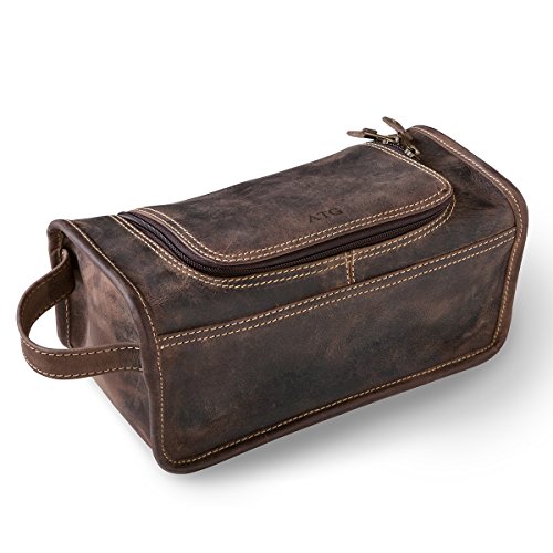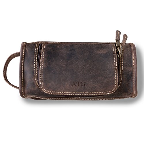 Product Description Pleasing your guy with our handsome Personalized Distressed Brown Borello Travel Dopp Kit will be easy due to the stylish and rugged craftsmanship of the distressed full-grain buffalo hide and functional, no-frills design. Plunging his hands inside to retrieve his dependable personal care items will be no problem with the travel gear's wide u-shaped opening, served by dual zippers. When considering gifts for him, this durable dopp kit can take any punishment he can dish out on the road, and the leather grab handle makes it easy to carry around or hang on a shower hook when he's ready to freshen up. His personal effects are pampered inside with a high-quality, tear-resistant polydrill lining. 0