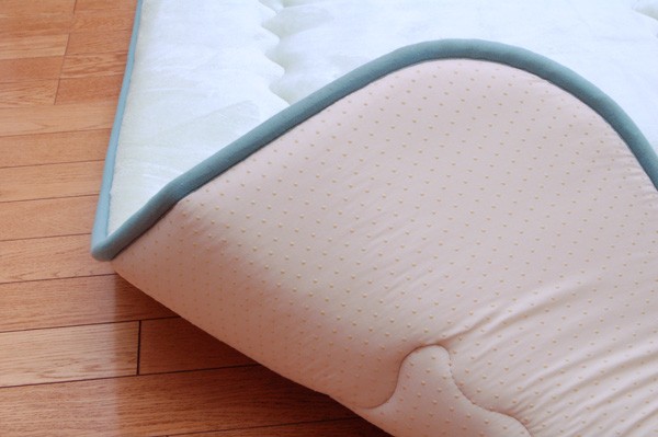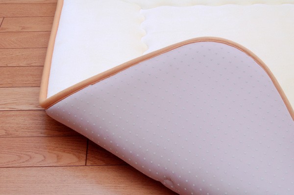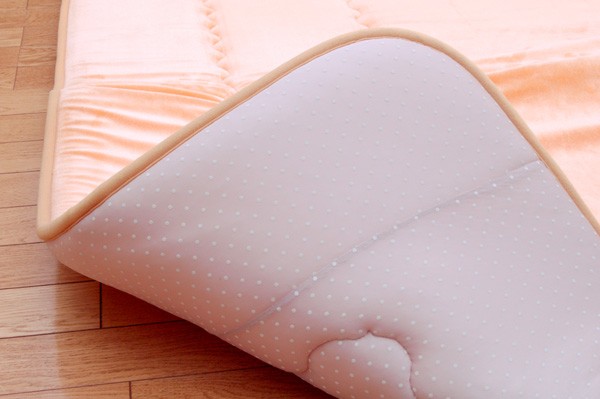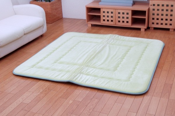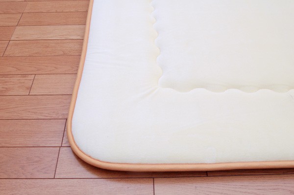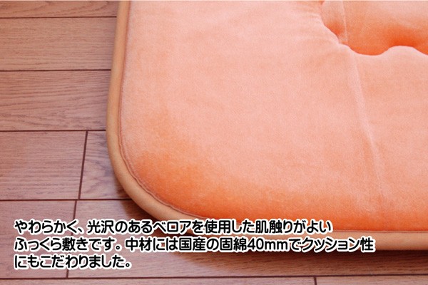 やわらかく、光沢のあるベロアを使用しています。肌触りが非常にソフトで保温性に優れ、深みのある光沢が特徴です。中材にはクッション性にこだわった国産の固綿40mmを使用しています。十分な弾力性があるのでフローリングでのご使用にも最適です。遮音特級LL-30を取得しています。床下への騒音も軽減します。また、こたつと併用するとこたつの熱を床下へ逃しにくくなるので省エネ効果もあります。