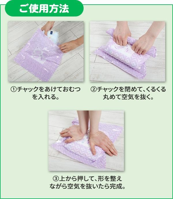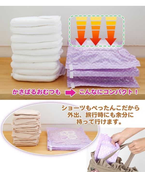 | 紙おむつを約3枚収納でき、さらに尿取パッドや失禁ショーツなどもまとめて圧縮できます!!外出や旅行時にもコンパクトに、また予備として余分に持っていくこともできます。 |