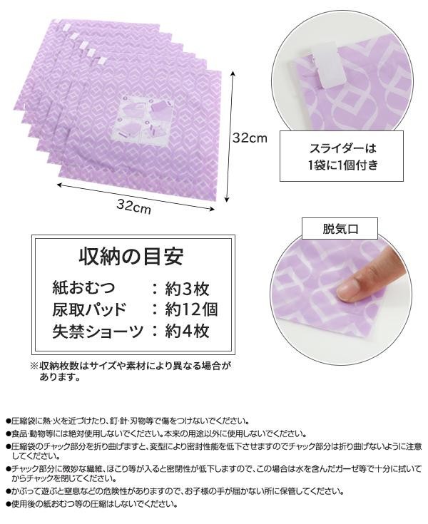 紙おむつを約3枚収納でき、さらに尿取パッドや失禁ショーツなどもまとめて圧縮できます!!外出や旅行時にもコンパクトに、また予備として余分に持っていくこともできます。 |